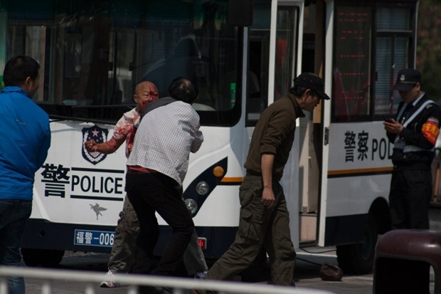 两名男子先扭打成一团,一光头男子脸部、上衣满是血迹,旁边的“移动警务室”,巡防员对讲机贴着嘴巴,似在汇报情况。