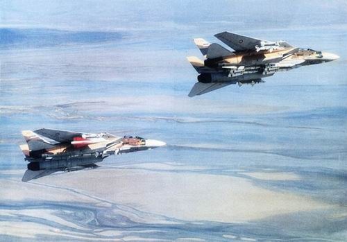 • 伊朗空军F-14A双机编队。第二架F-14A机翼下挂了改型“霍克”空空导弹